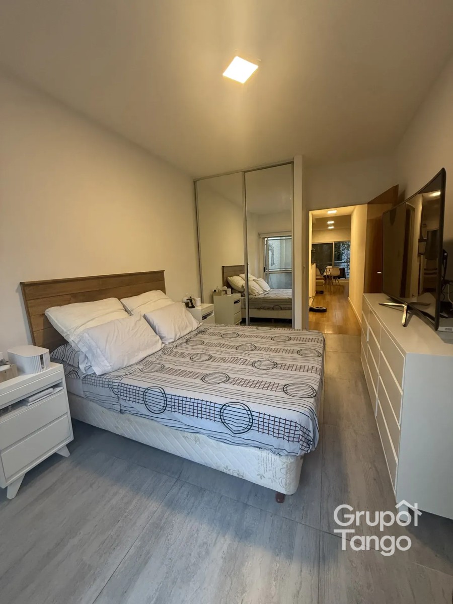 Apto crédito. Apto profesional. Departamento de 2 ambientes, al frente, 1° piso. Superficie total de 55 m², cubierta de 40 m² y descubierta de 15 m². Un dormitorio, un baño completo. Living-comedor, cocina. Balcón y patio. Agua caliente central. Losa radiante individual. Vidrios DVH. Muy buen estado, luminoso. Pisos de madera.